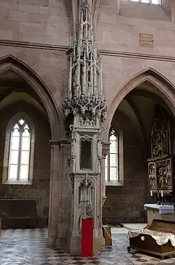 Auch im Westchor, der sogenannten Ritterkapelle, ist eine Grablege des Adels mit Bildsteinen aus dem 15. Jahrhundert. Im südlichen Seitenschiff befindet sich ein weiteres Mortuarium mit Grabmälern des 15. und 16. Jahrhunderts;[3] weitere in den beiden Seitenschiffen, sowie im Querschiff und im Chor.[20] Wegen ihrer vielen Grabdenkmäler hat man der ehemaligen Klosterkirche auch den Titel „Schlafkammer des fränkischen Adels“ verliehen.