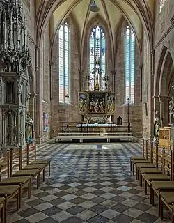 Der spätgotische Hauptaltar wird dem Künstlerkreis um Michael Wolgemut zugeschrieben. Seitlich im Chor befindet sich ein ebenfalls spätgotisches Sakramentshäuschen. Im Mittelschiff, das noch die Formen der Romanik zeigt, befinden sich die Grablegen mehrerer Kurfürsten von Brandenburg sowie Markgrafen von Ansbach.