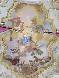 Im Fresko an der Decke des Chorraums ist die Anbetung der Heiligen Drei Könige dargestellt, gemalt von Johann Georg Lederer im Jahr 1757. Der Fuß eines Mohren ist dabei mit Stuck plastisch ausgearbeitet und hängt aus dem Bild heraus.[2] Das nördliche Seitenbild zeigt die eherne Schlange und verweist mit einer Inschrift auf Numeri 21,9 . Südlich ist der Paradiesbaum zu sehen mit einem Hinweis auf Genesis 3 .[3]