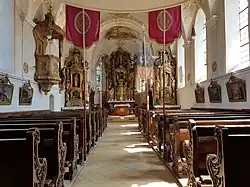 Der linke Seitenaltar zeigt zentral eine Madonna, daneben den hl. Sebastian (links) und die hl. Katharina (rechts) sowie im Auszug den hl. Jakobus. Der rechte Seitenaltar enthält in der Mitte eine Anna selbdritt, umgeben von Figuren des hl. Urban (links) und des hl. Christophorus (rechts).[2]