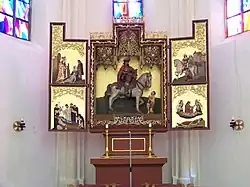 Außen wird das Gotteshaus durch einen umlaufenden Sockel, Strebepfeiler und einen Dachfries gegliedert. Die Innenausstattung stammt aus unterschiedlichen Epochen. So stammen eine Schnitzfigur von St. Martin auf dem Pferd mit dem knienden Bettler aus der Zeit zwischen 1520 und 1530, der Taufstein sowie ein in Stein gehauenes Antlitz (wohl das des unbekannten Baumeisters der Kirche) noch aus der Epoche der Gotik. Der Volksaltar wurde 1967 nach den Vorgaben des Zweiten Vatikanischen Konzils aufgestellt. Der Hochaltar wurde zur 500-Jahr-Feier des Baubeginns 1977 durch einen neugotischen Aufbau ersetzt, der an zentraler Stelle die gotische Sankt-Martins-Figur beherbergt. Die Altöttinger Kapelle, die an der Nordseite der Kirche angebaut ist und sich über einen Spitzbogen zum linken Seitenschiff öffnet, ist mit einer Marienfigur des österreichischen Bildhauers Albin Moroder aus dem Jahr 1977 ausgestattet.[3] Der mächtige Kirchturm ist an der Spitze mit Kupfer beschlagen; er besitzt eine Höhe von 64 m, mit Kreuz 68 m.