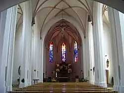 Die Kirche erinnert in vielen Punkten stark an die Martinskirche in Landshut, die als Vorbild für den Bau gedient haben dürfte und zu ähnlicher Zeit fertiggestellt wurde. So handelt es sich bei beiden Gotteshäusern um dreischiffige Hallenkirchen der Backsteingotik, bei denen die Seitenschiffe je halb so breit sind wie das Mittelschiff. Der gegenüber dem Mittelschiff kaum eingezogene Chor wird wie bei der Landshuter Kirche von einem kaum merklichen Chorbogen abgetrennt, in dessen spitzbogigem Abschluss sich ein großes Kruzifix befindet. Bei der Geisenhausener Kirche wurde dieses im Zuge der Barockisierung 1688 angebracht.[3]