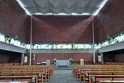 Die Kirche ist ein brutalistischer Betonquader, dessen Innenwände mit roten Ziegeln verkleidet sind. Das umlaufende Fensterband aus abstrakten Grün- und Grauflächen wurde von Ernst Neukamp geschaffen. Im Jahr 1978 schuf Werner Persy das über dem Hauptaltar hängende Mosaik-Triumphkreuz und 1981 den Kreuzweg, der die Passion Christi mit modernen Elementen darstellt.[4] Die Altarinsel und die Priestersitze sind jeweils leicht erhöht. Der Kirchturm besteht aus Betonplatten, ist 27 Meter hoch und wurde freistehend südwestlich der Kirche errichtet, welcher ein monumental wirkendes Bronzegeläute in Schlagtonfolge cis1 – e1 – fis1 – gis1 – h1 der Erdinger Glockengießerei trägt.[5][4]