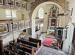 Der Altar von 1784 ist prunkvoll gestaltet. Der Stuhl der Kirchenältesten steht neben dem Altar und ist mit den Namen bedeutender Bürger des Dorfes versehen.[1]
