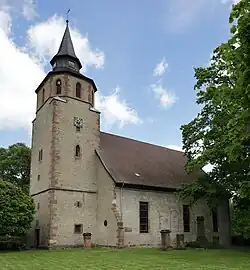 Das Erdgeschoss des querrechteckigen Kirchturms im Westen ist noch romanischen Ursprungs. Die gotischen Aufstockungen erhielten schließlich 1578 einen achteckigen Aufsatz, in dem sich hinter den Klangarkaden der Glockenstuhl befindet, in dem 3 Kirchenglocken hängen. An einer Klangarkade hängt die Schlagglocke der Turmuhr. Bekrönt wird der Turm von einem schiefergedeckten spitzen Helm. 1716 erhielt das Langhaus große Rechteckfenster, und im Osten wurde ein dreiseitiger Abschluss angefügt. Das Erdgeschoss des Turms ist mit einem Kreuzgewölbe überspannt und wurde 1980 zum Langhaus durch eine Arkade geöffnet.