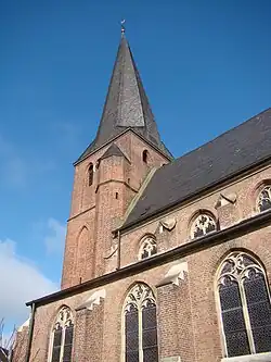 Der Kern der kreuzrippengewölbten, dreischiffigen Backsteinbasilika ist das im zweiten Viertel des 15. Jahrhunderts als einschiffige Kapelle erbaute Mittelschiff. Es wurde um 1500 um das nördliche Seitenschiff erweitert und es wurde der Westturm vorgesetzt. Das südliche Seitenschiff wurde 1850 angebaut. Der dreigeschossige Turm wird von einem polygonalen Treppentürmchen begleitet. Der Turm ist durch Spitzbogenblenden gegliedert und wurde im 18. Jahrhundert mit einer Schieferpyramide geschlossen. Die kreuzrippengewölbte Turmhalle ist in großen Spitzbögen zum Mittelschiff hin geöffnet. Darüber befand sich das heute zugemauerte Westfenster des ursprünglichen Kapellengebäudes. Am Mittelschiff befindet sich der Chor mit 5/8 Schluss. Die alte Sakristei am nördlichen Seitenschiff, in Form eines polygonal geschlossenen Chörchens, wird derzeit als Taufkapelle genutzt. Die Kirche wurde nach Beschädigungen im Zweiten Weltkrieg bis 1953 wiederhergestellt.