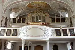 Das einschiffige Langhaus ist in vier Joche unterteilt und wird von einer flachen Korbbogentonne mit Stichkappen über den Fenstern gedeckt. Ein runder Chorbogen öffnet das Langhaus zum eingezogenen, dreiseitig geschlossenen Chor. Den westlichen Abschluss des Langhauses bildet eine auf vier Säulen aufliegende, doppelgeschossige Orgelempore. Der Mittelteil der unteren Emporenbrüstung ist weit ausgebaucht.