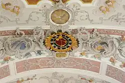 Die beiden großen Wappenkartuschen am Chorbogen, in deren Mitte eine Uhr angebracht ist, wurden ursprünglich von Johann Michael Dreyer geschaffen und 1912 rekonstruiert. Sie erinnern an die Heirat von Markus von Rehlingen-Hainhofen und Maria von Rehlingen-Horgau im Jahr 1692 und enthalten die Allianzwappen der beiden Familien. Unter der Uhr mahnt die Inschrift Jede verletzt, die letzte tötet an die Stunde des Todes.