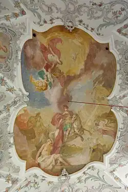 Die Fresken des Langhauses stellen die Heilung eines Kranken durch den heiligen Martin, die Messfeier des Heiligen und seinen Tod dar. Über der Empore wird die Aufnahme des heiligen Martins in den Himmel dargestellt. Die Szenen auf den Stichkappen erzählen die Geschichte des heiligen Wendelins. Sie zeigen ihn als Königssohn, als Pilger, als Hirten und als Einsiedler in der Wüste, der nach seinem Tod in den Himmel aufgenommen wird.