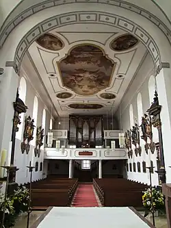 Die Kirche ist vor allem wegen des Hochaltars von Christoph Rodt aus dem Jahre 1604 bekannt. Als weitere Ausstattung befinden sich Epitaphe der Familie Vöhlin aus dem 16. bis 18. Jahrhundert in der Vöhlinschen Gruftkapelle.