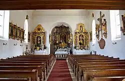 Der Innenraum des Langhauses ist mit einer Flachdecke überspannt, der des Chors, d. h. das Erdgeschoss des Chorturms, mit einem Kreuzrippengewölbe auf Konsolen. Der Hochaltar wurde um 1730 gebaut. Sein Altarretabel wird von den Statuen des heiligen Franz Xaver, des Johannes Nepomuk, des heiligen Rochus und des heiligen Wendelin flankiert. An der Südwand befindet sich eine Kreuzigungsgruppe aus dem 18. Jahrhundert. Die einmanualige Orgel auf der Empore wurde von Joseph Bittner gebaut.