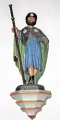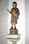 | 14 | Heilig-Kreuzer-Bäuerchen | Holz | 90 cm | Hauptschiff Durchgang Seitenschiff: Diese Figur stammt aus einer Außennische der sich im Wispertal befindlichen Kreuzkapelle (gegenüber Gewerbegebiet), dort befindet sich heute eine Kopie derselben. In Lorch wird sie als Heilig-Kreuzer-Bäuerchen bezeichnet. Es soll sich um den Küster Ambrosius handeln, der der Sage[19] nach den Bau dieser Kapelle mit herbeigeführt hat. Wahrscheinlich handelte es sich ursprünglich um den Hl. Wendelin, den Schutzpatron der Hirten. | um 1700 | |