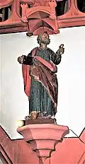 | 18 | Hl. Petrus | Holz | 115 cm | An der Brüstung der Empore auf einem Sandsteinpodest steht der Hl. Petrus mit Schlüssel und Bibel in den Händen. Die Figur stand ehemals in der Kreuzkapelle und wurde 1988, aus Sicherheitsgründen, hier aufgestellt. | um 1500 | |