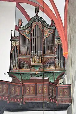 - Spielhilfen: 6 freie Kombinationen, Feste Kombinationen (Tutti, Organo pleno), p-Pedal, Absteller Zungenregister
