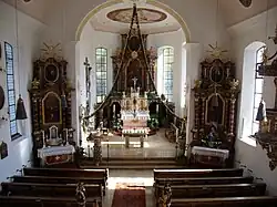 Der Innenraum des Langhauses ist mit einer Flachdecke überspannt, die von Vouten gerahmt wird. Die spätgotischen Wandmalereien, auf denen eine Mondsichelmadonna dargestellt ist, werden Hans Strigel dem Älteren zugeschrieben. Die 1819 von Alois Keller eingefügten Fresken zeigen im Chor u. a. den Erzengel Gabriel und im Langhaus die Christi Himmelfahrt. Von ihm stammen auch die Porträts der Apostel. Das Sakramentshaus wurde um 1500 errichtet. Das Altarretabel des um 1725 gebauten Hochaltars wurde 1818 von Joseph Hauber gestaltet.