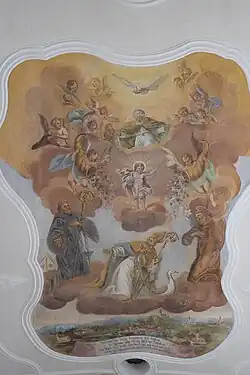Die Deckenbilder im Chor wurden 1754 von Franz Albert Aiglsdorfer ausgeführt. Das zentrale Gemälde zeigt Jesus mit seinen Wundmalen, von einem Strahlenkranz umgeben. Aus seiner Seitenwunde fließt Blut, das von zwei Engeln in Kelchen aufgefangen wird. Auf den beiden seitlichen Szenen sind links Melchisedech dargestellt, der ein Opfer aus Wein und Brot darbringt und Abraham segnet, und rechts Abraham, der bereit ist, seinen Sohn Isaak zu opfern. Über dem Choraltar sind noch Reste einer älteren Deckenbemalung erhalten.