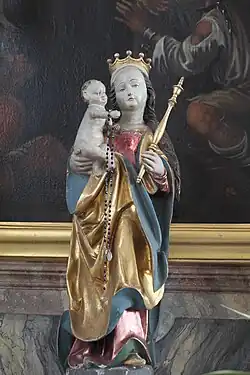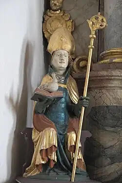 - Der nördliche Seitenaltar ist dem heiligen Leonhard gewidmet, links steht die heilige Walburga, rechts die heilige Notburga mit ihrem Attribut, der Sichel. Die Skulptur der Madonna mit Kind auf der Altarmensa wird ins frühe 16. Jahrhundert datiert, die kleine Martinsfigur stammt aus der Zeit um 1440/50.