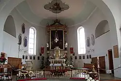 Die frühklassizistische Saalkirche wurde 1797/98 nach einem Entwurf von Johann Georg Specht erbaut. Sie besteht aus einem Langhaus, einem eingezogenen, halbrund geschlossenen Chor im Nordosten, einer Sakristei im Südosten und einem Chorflankenturm im Nordwesten des Chors, dessen oberen Geschosse mit abgeschrägten Ecken den Glockenstuhl mit sechs Kirchenglocken und die Turmuhr beherbergen. Darauf sitzt eine Zwiebelhaube. Vor der Fassade im Südwesten befindet sich ein Anbau für das Portal. Der Innenraum des Langhauses ist mit einer Flachdecke überspannt. Das 1830 von Alois Keller mit Johannes dem Täufer bemalte Altarretabel des Hochaltars wird von Statuen flankiert. Von ihm stammen auch die Gemälde der Apostel. Die Orgel wurde 1888 von G. F. Steinmeyer & Co. gebaut.