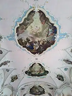 Am 28. Oktober 1936 brannte aufgrund eines Heizungsdefekts im Turmbereich die katholische Pfarrkirche aus. Dabei wurden im Innern zahlreiche Kunstwerke des 18. Jahrhunderts vernichtet. In seinem Bericht vom 11. Januar 1937 listete der damalige Pfarrer Josef Blum die verbrannten Gegenstände auf: Die Bilder der Seitenaltäre, der Schrein des hl. Coelestin, ein holzgeschnitzter Taufsteinaufsatz, Betstühle, die Orgel, sämtliche Stationsbilder, die Weihnachtskrippe, sämtliche Prozessionsstatuen, sämtliche Sakristeischränke, alle vier Glocken, Goldbrokatgewänder, sämtliche Musikalien des Kirchenchores. Auch die Kanzel und der Dachstuhl wurden ein Opfer der Flammen. Alle Gemälde und Stuckaturen waren zerstört.
