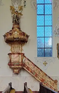 Anhand alter Bildvorlagen wurden die Verzierungen und die Stuckornamente von dem Stuckateur Hans Georg Gigl nach dem Krieg durch die Firma Wiener & Schäffert rekonstruiert. Die mit einem Standbild des Hl. Michael gekrönte barocke Kanzel, vormals an der Ostseite, wurde an der westlichen Seite im Langhaus angebracht. Die weiß bemalten Holzfiguren der Apostel Petrus und Paulus, die Nebenpatrone der Kirche waren und am Hochaltar standen, wurden unterschiedlich stark beschädigt. Während die Statue des Hl. Paulus schwer geschädigt wurde, ist die Statue des Hl. Petrus vollständig verbrannt.