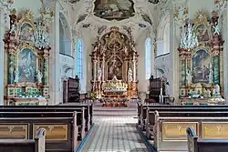 1745 ging es an die äußere und innere Ausstattung. Der Schreinermeister Franz Rudhart und seine Arbeiter lieferten die Türen, Bänke und die Orgelempore. Während die zahlreichen Stuckarbeiten von Johann Georg Gigl gefertigt wurden, wurden die Altar- und Deckengemälde von dem Vorarlberger Meister Benedikt Gambs gemalt. Die drei Glocken, eine kleine Orgel und eine Muttergottesstatue wurden aus der alten Pfarrkirche übernommen. Der Weihbischof Franz Karl Josef Fugger von Konstanz nahm am 3. August 1749 die Weihe der Kirche auf die Namen der Kirchenpatrone Sankt Martin und der hl. Apostel Peter und Paul vor.