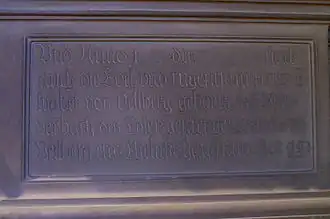 Inschrift auf der linken Seite des Sockels: „Anno Dni 1592 den 15 Juny starb Sinngemäße Bedeutung der Inschrift: Im Jahre des Herrn 1592 den 15. Juni starb |