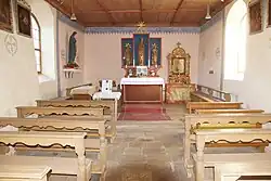 Der Innenraum der Kapelle ist mit einer getäfelten Flachdecke überspannt. In drei schlicht gestalteten hochrechteckigen Feldern des Hauptaltars aus neuerer Zeit stehen naturbelassene, aus Holz geschnitzte Figuren des heiligen Jakobus des Älteren, des Kirchpatrons St. Martin und des heiligen Sebastian. Die Statue des hl. Martin ist deutlich größer als die beiden anderen. Sebastian, der allgemein weitgehend entkleidet und mit Pfeilen durchbohrt dargestellt wird, trägt hier ein Gewand und hält die Pfeile als Zeichen seines Martyriums in der Hand.