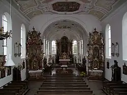 Die Beichtstühl stammen aus dem Jahr 1779, das Chorgestühl aus der Zeit um 1780. Beides wurde von Benedikt Schuhbauer geschaffen. Ein verwittertes Epitaph von Ulrich von Riedheim († 1500) mit der Darstellung einer stehenden Relieffigur befindet sich im ehemaligen Beinhaus.