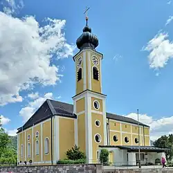 Die barocke Saalkirche aus einem Langhaus, einem eingezogenen, dreiseitig geschlossenen Chor im Osten und einem Kirchturm auf quadratischem Grundriss im Westen wurde in den Jahren 1780 bis 1783 anstelle eines Vorgängerbaus von 1508/09 erbaut. Nach Plänen von Michael Steinbrecher wurde von 1961 bis 1963 ein neues Langhaus nach Süden angebaut und der Innenraum umorientiert. Der Kirchturm wurde mit einem Geschoss mit abgeschrägten Ecken aufgestockt, das die Turmuhr und den Glockenstuhl enthält, und mit einer Welschen Haube bedeckt.