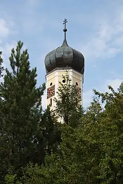 Die Saalkirche wurde 1729 nach einem Entwurf von Johann Balthasar Zimmermann erbaut. Sie besteht aus einem Langhaus, einem eingezogenen, dreiseitig geschlossenen Chor im Osten und einem Chorflankenturm auf quadratischem Grundriss an dessen Südwand. Er wurde später achteckig aufgestockt, um die Turmuhr und den Glockenstuhl unterzubringen, und mit einer Zwiebelhaube bedeckt.