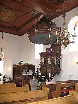 Das älteste Stück der Einrichtung ist ein romanischer Taufstein. Nach seiner einfachen Form mit vier Gesichtern an den Seiten stammt er vermutlich aus dem 12. oder 13. Jahrhundert.
