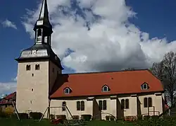 Das jetzige Kirchenschiff wurde 1605 nach Osten an den Kirchturm der um 1200 entstandenen Wehrkirche angebaut. Der quadratische Turm erhielt 1792–94 eine schiefergedeckte, geschweifte Haube, das die Zifferblätter der Turmuhr enthält. Darauf sitzt eine offene Laterne. Im oberen Bereich hat der Turm an jeder Seite je zwei Biforien als Klangarkaden. Die dazwischen liegenden kleinen Säulen haben Würfelkapitelle. Das Foyer im Turm ist mit einem Kreuzgratgewölbe überspannt. Das mit einem Krüppelwalmdach bedeckte Kirchenschiff hat zwischen den Strebepfeilern paarige, segmentbogige Fenster. An der Nordseite befindet sich ein polygonaler Treppenturm.
