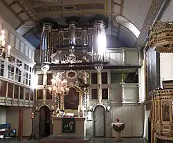 Der Innenraum ist mit einer Flachdecke aus Brettern mit Vouten überspannt. Im Westen, Norden und Osten befinden sich doppelgeschossige Emporen, in deren Brüstungen Ölbilder Szenen des Alten und des Neuen Testaments darstellen. Auch der barocke Altar präsentiert Gemälde. Auf der linke Seite sind die Schriftpropheten, auf der rechten Seite die vier Evangelisten zu sehen. In der Mitte über dem Altar ist das Abendmahl Jesu dargestellt. Der Altar wird gekrönt mit der Orgel, die mit 16 Registern, verteilt auf zwei Manuale und ein Pedal, 1734 von Johann Georg Müller, Vater von Johann Conrad Müller gebaut wurde.[1] Die hölzerne Kanzel auf einer achteckigen Säule mit einem Schalldeckel stammt von 1612, das Taufbecken vom Ende des 16. Jahrhunderts.