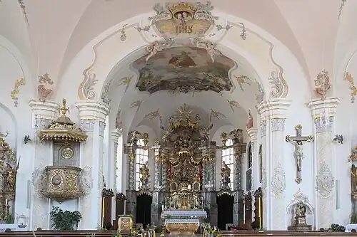 Der Innenraum des neuen Langhauses ist mit einem Gewölbe aus Rabitz überspannt. Den Stuck schuf Anton Kaindl. Die Deckenmalerei hat Anton Ranzinger ausgeführt. Der Hochaltar von 1781 wurde 1911 von Joseph Elsner senior überarbeitet.