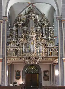 Vor 1774 erweiterte Johann Christoph Hüsemann die Orgel um ein drittes Manualwerk. Die Firma Furtwängler & Hammer baute im Jahr 1899 hinter dem historischen Gehäuse ein romantisches Werk ein. Dieses wurde im Zweiten Weltkrieg zerstört, während das Gehäuse die Kriegsjahre relativ unbeschadet überstand. Die heutige Orgel wurde 1969–1972 von den Gebrüdern Hillebrand erbaut. Die Klangdisposition nahm die Orgel von 1631 zum Ausgangspunkt.[11] Die heutige Orgel verfügt über 45 Register und weist folgende Disposition auf:[12]