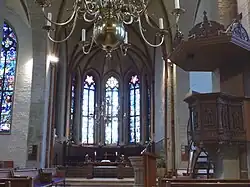 Die Scheidelinie zwischen Chorraum und dem übrigen Kirchenschiff bildet der hölzerne Hauptaltar mit dem die Fülle und Vollkommenheit Gottes symbolisierenden schweren, bronzenen, siebenarmigen Tischleuchter. Die einst auf dem Abendmahlstisch ausgelegte Altarbibel trug unter ihrem Deckblatt folgende handsignierte Inschrift des Theologen und Friedensnobelpreisträgers Albert Schweitzer: Welche der Geist Gottes treibt, die sind Gottes Kinder. Möge von dieser Bibel, wenn aus ihr im Gottesdienst gelesen wird, der Geist Gottes die Herzen der Menschen bewegen und fähig machen, sich von ihm regieren zu lassen.