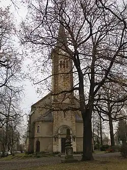Die Kirche ist von einer kleinen Parkanlage umgeben, in der zwei Kriegerdenkmäler stehen. Das Kriegerdenkmal für die Gefallenen des Ersten Weltkriegs steht vor der Kirche und ist interessant gestaltet. Das ältere ist den Gefallenen des Deutsch-Französischen Kriegs 1870/71 gewidmet.