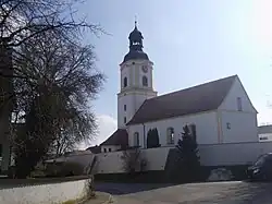 Es handelt sich um eine im Kern spätmittelalterliche Chorturmkirche, das bedeutet, dass das Untergeschoss des Turmes im Osten den quadratischen Chor bildet. Dort findet man ein barockes Kreuzgratgewölbe vor, während das Langhaus über einer Kehle flachgedeckt ist. Im Westen befindet sich eine Empore über dem Portal mit der kleinen offenen Vorhalle. Der Chorbogen ist korbbogig, die Fenster sind segmentbogig. Über dem im Grundriss quadratischen dreigeschossigen Unterbau des Turmes steht ein Oktogon, dessen Eckflächen nur ein Drittel der Breite der Hauptflächen aufweist. Dieses Glockengeschoss hat an allen vier Hauptseiten eine rundbogige Schallöffnung sowie im Osten und im Westen ein Ziffernblatt der Turmuhr, die 1869 beschafft wurde. Auf dem geschwungenen Turmhelm sitzt eine offene Laterne mit welscher Haube, Turmkugel und Patriarchenkreuz. Die Sakristei befindet sich im nördlichen Chorwinkel; sie nimmt fast die Turmbreite ein und ragt weit über die Nordwand vor. Während die gotischen Bauteile aus Kalkquadern ausgeführt sind, wurde für die Neu- und Umbauten der Barockzeit Kalkbruchstein verwendet.[3]