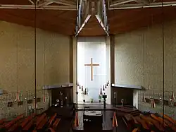 Zur Orgelempore über dem Eingangsbereich führt eine Wendeltreppe aus einer der Nischen hinauf. Die Estrade reicht fast bis zur Raummitte, die Bänke des Kirchengestühls sind halbkreisförmig um den darauf stehenden Altar angeordnet.