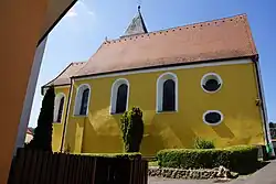 Das Langhaus der ursprünglich einschiffigen Kirche wurde Mitte des 18. Jahrhunderts nach Süden mit drei Arkaden geöffnet und um ein barockes Seitenschiff erweitert. Dadurch kommt auch das asymmetrische Frackdach zustande.