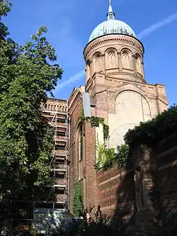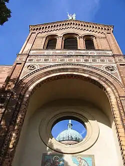 Der dreischiffige Backsteinbau ist 55 m lang und 30 m hoch, das Langhaus ist 19 m breit. Überragt wird die Kirche von der 56 m hohen, mit Kupferblech gedeckten Kuppel, die auf dem mit Rundbogenarkaden verzierten Tambour thront, der sich über der Vierung erhebt. Auf den Eckpfeilern der Vierung standen vor der Zerstörung Statuen der vier Evangelisten auf hohen Postamenten.