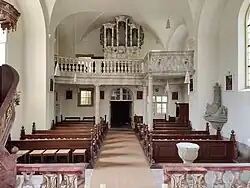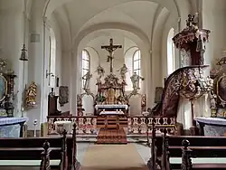 Die Kirche ist im Stil des Rokoko ausgestattet. Der Hochaltar besteht aus einem Kruzifix über dem Tabernakel, flankiert von vier Heiligenfiguren. An den Seitenaltären sieht man Gemälde von Georg Sebastian Urlaub. An der Kanzel befinden sich Figuren der vier Evangelisten. Die Orgel wurde 1761 von Johann Philipp Seuffert erbaut. Das Werk hat 10 Register auf 1 Manual und Pedal.[1]