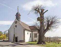 Die Kreuzkirche wurde um 1750 erbaut. Sie besteht aus einem Langhaus, das im Osten vor dem dreiseitigen abgeschlossenen Chor, an dem die Sakristei angebaut ist, von einem Querschiff gekreuzt wird, das mit einem Walmdach bedeckt ist. Aus dem Satteldach des Langhauses erhebt sich im Westen ein schiefergedeckter, achteckiger Dachreiter, der mit einer Glockenhaube bedeckt ist. Die Kirchenausstattung stammt aus der Bauzeit.