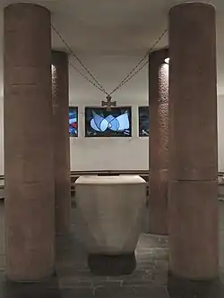 Bei dem Umbau zur Begräbniskirche im Jahr 2025 für 2500 Urnen[10] erfolgt eine Umgestaltung des Innenraums in neun große und zwei kleinere offene Kreise, die sich in dem langgezogenen Raum verteilen. Darüber hinaus entstehen runde Sitzbereiche auf dem Vorplatz der Kirche und zwei kreisförmige Urnenwände sowie das „Ewigkeitsgrab“ im Kirchgarten nach einem Entwurf des Architektenbüros Meixner, Schlüter und Wendt.[11] bei der Umgestaltung bleibt der lichterfüllte hohe Raum erhalten. Die Urnenplätze werden in 2,50 Meter hohen offenen Ringen angelegt, die ein Motiv des ursprünglichen Architekten der Kirche Rudolf Schwarz aufgreift. Die Öffnung stellt ein Schwelle vom Weltlichen zum Ewigen, zwischen Diesseits und Jenseits dar. Die unterschiedlich weiten Zylinderfragmente sind entlang der von dem Taufbrunnen und dem Altar bestimmten Längsachse angeordnet. Die Figur von Kreis und Zylinder taucht auch in den Außenbereichen in den kreisförmigen Sitzbereichen auf.[12]