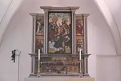 Der Altaraufsatz gehört nicht zur ursprünglichen Kirchenausstattung. Er wurde der Kirche vom Bistum Augsburg als Dauerleihgabe überlassen. Auf der Predella ist das Entstehungsjahr 1536 zu lesen, die beiden Wappen der Herrschaften Werdenberg und Zug verweisen auf die Herkunft des Altars aus der Schweiz. Der Stifter, der mit dem Rücken zum Betrachter steht, und seine Familie sind im Gebet dargestellt. Über den Köpfen der bereits verstorbenen Familienmitglieder ist ein Kreuz gemalt. In der Szene im Vordergrund sieht man ihren Gräbern entstiegene Arme Seelen, die vor zwei Teufeln zu fliehen versuchen. Zwei Engel, einer mit einem Flammenschwert, ein anderer mit einem Kreuzstab, kommen ihnen zu Hilfe.
