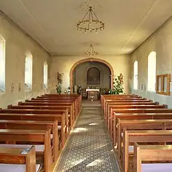 In der Kirche befindet sich eine Pietà, unter der der Erbauer der Kirche, Pfarrer Leo Montada, beerdigt ist.[19] Die geschnitzte barocke Darstellung Mariens mit ihrem toten Sohn auf dem Schoß entstand etwa 1770 und bildete ursprünglich das Altarbild der alten Körpricher Kapelle, in der sich seit 1935 ein Schönstatt-Bild als Ersatz für die Mater dolorosa befindet.[20] Der Nebenaltar des linken Querhauses ist der Jungfrau von Fatima, der Nebenaltar des rechten Querhauses dem heiligen Josef geweiht. Der Triumphbogen der Apsis ist mit den Symbolen der vier Evangelisten und dem apokalyptischen Lamm bemalt. An den Pfeilern, die vom Querhaus zum Chorbogen überleiten, befinden sich Statuen des Erzengels Michael und der heiligen Barbara von Nikomedien. Im leicht erhöhten Altarraum, der im Jahr 1963 einer Modifizierung unterzogen wurde, befinden sich über dem Hochaltar drei Buntglasfenster, die (v. l. n. r.) die Heilige Familie, den Erzengel Michael im Kampf mit dem Satansdrachen sowie die Geburt Christi zeigen. Die übrigen Fenster im Lang- und Querhaus zeigen marianische Symbole und Anrufungen Mariens aus der Lauretanischen Litanei. Die Türen des Tabernakels stellen in Treibarbeit links zwei Tauben dar, die an einem Quellbrunnen ihren Durst stillen, sowie rechts zwei Lämmer vor einer Säule, die von einem kristallinen Strahlenkranz umgeben ist. Die Bilder des Kreuzweges sind Kopien des Führich-Kreuzweges aus der ersten Hälfte des 19. Jahrhunderts. Joseph von Führich, Akademieprofessor in Prag, Wien und Rom sowie bedeutender Vertreter der sakralen Malerei in den Ländern der Habsburgermonarchie, hatte die Originale im Jahr 1834 für die Kirche am St. Laurenziberg in Prag entworfen. Die weite Verbreitung dieser Kreuzweg-Motive erklärt sich dadurch, dass ab dem Jahr 1836 von den Originalen Führichs Kupferstichkopien angefertigt wurden und zahlreiche Maler diese als Vorlage für von ihnen gefertigte Kreuzwegtafeln benutzten. Die Künstler dieser Kopien sind meist unbekannt.[21]