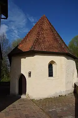 Unmittelbar neben der Kirche befindet sich eine Kapelle, die sogenannte Schäferkapelle, die heute als Aussegnungshalle genutzt wird.[5] Ihre Bauzeit wird im 14. Jahrhundert vermutet. Die Formen der gotischen Maßwerkfenster lassen sich in das 14. Jahrhundert datieren. Bei Probegrabungen im Nordteil des Chors 1983 zeigte sich, dass die Kapelle über einem älteren Friedhof errichtet ist. Im oberen Bereich der panierten Schuttschichten fanden sich außer einigen Münzen des 16. und 17. Jahrhunderts einige Dutzend Votivfiguren, Beschläge und Stücke von Hufeisen. Sie waren im Boden des Kirchenschiffs regellos verteilt und weit verstreut. Anscheinend wurden sie in nachreformatorischer Zeit bei Bauarbeiten im Kirchenschiff mit Bauschutt zugedeckt. Unter den Votiven fällt ein halbes Dutzend stehender menschlicher Figuren auf, die meist die Hände zum Gebet erheben oder zusammenlegen. Dazu kommt ein einzelner massiv geschmiedeter Kopf mit ausgeprägter Nase und deutlich eingepunzten Augen und Mund; außerdem zwei Beinvotive sowie eine Hand mit gespreizten Fingern, eine Schwurhand darstellend. Zahlreicher treten sechs bis acht Zentimeter große Votive von vierbeinigen Tieren auf. Nur bei wenigen Votiven lässt sich die Tierart annähernd bestimmen: bei den großen Votiven wohl Pferd, Esel oder Rind, einmal ein Schwein, bei den kleinen Votiven wohl Hunde und auch Schafe. Dies könnte die Überlieferung bestätigen, dass die Kapelle in Rasch früher von einheimischen Schäfern zur Andacht genutzt wurde. Ein Zusammenhang mit der Verehrung des Heiligen Leonhard wie in manchen Orten von der Oberpfalz bis nach Mähren scheint hier nicht gegeben zu sein. Archäologisch noch weniger andeuten oder gar erweisen lässt sich ein Bezug zu einer früheren Verehrung germanischer Gottheiten. Im 8. Jahrhundert – zu Zeiten des Frankenapostels Willibald von Eichstätt – wurde das Altdorfer Land christianisiert und Missionare haben den christlichen Glauben von der als Taufkirche genutzten Kapelle aus ins Umland verbreitet. Heute weist ein romanischer Taufstein auf die durchgeführten Ganzkörpertaufen hin. Die einfachen, an den Wänden befindlichen sieben Apostelkreuze wurden im Zuge der Renovierung in den 1950er Jahren freigelegt. Sie stammen wohl aus dem 18. Jahrhundert. Nach der Reformation wurde die Kapelle profaniert, diente zur Lagerung landwirtschaftlicher Erzeugnisse. Mit der Renovierung 1952 wurde sie zum Leichenhaus.