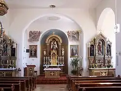 An der Südwand des Langhauses, gegenüber der Kanzel, flankieren die Pestpatrone Sebastian (links) und Rochus (rechts) auf Wandkonsolen ein Missionskreuz. Weitere Figuren befinden sich in den Querschiffarmen: nördlich der heilige Antonius von Padua, südlich der heilige Konrad von Parzham. An der nördlichen Langhauswand ist eine Figur der Mater Dolorosa angebracht. Gerahmte Bilder im Nazarenerstil im Chorraum stellen links die Heilige Familie, rechts die Heiligen Isidor von Madrid und Franz Xaver dar. Erwähnenswert ist außerdem eine barocke Rosenkranzmadonna.[2]