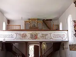 An der Emporenbrüstung ist mittig ein Gemälde der heiligen Cäcilia, Patronin der Kirchenmusik, eingerahmt von zwei musizierenden Engeln, zu sehen. Zu beiden Seiten des Gemäldes steht folgender Spruch: Gloria in excelsis Deo! / Ehre sei Gott in der Höhe / u. Friede den Menschen auf Erden, / die eines guten Willens sind! Außerdem befindet sich in der Kirche eine Täufergruppe aus der Zeit um 1780. Diese wurde von der Werkstatt des berühmten Landshuter Bildhauers Christian Jorhan d. Ä. geschaffen.[1][2]