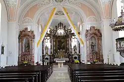 Die Kirche wurde mit neuen, aber auch mit Gegenständen aus der Vorgängerkirche ausgestattet. Der Hochaltar aus dem Jahr 1912 ist ein Holzaufbau und stilistisch an den Hochaltar der Wallfahrtskirche Marienweiher angelehnt. Er wurde von der Firma Schoyerer aus Cham ausgeführt. Auf dem linken Seitenaltar steht eine Nachbildung einer gotischen Madonna aus dem Jahr 1972, auf dem rechten Seitenaltar eine barocke Statue des heiligen Josef, gefertigt um 1750/1760.